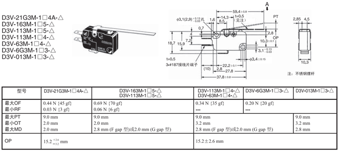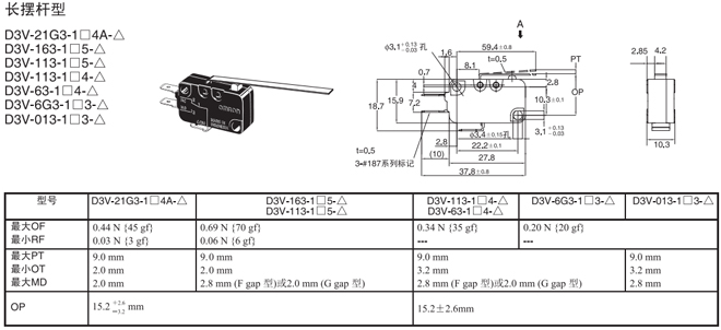 | 短擺桿型 | 內(nèi)部安裝 | 1.23N {125gf} | D3V-21G1-1□4A-△ | D3V-21G1-2□4A-△ | D3V-21G1-3□4A-△ |