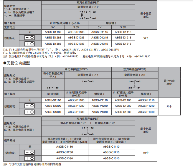 A8GS 遠(yuǎn)程復(fù)位 船形開(kāi)關(guān) 帶復(fù)位功能船形開(kāi)關(guān) 利用基于外部信號(hào)的 “復(fù)位功能”關(guān)閉電源開(kāi)關(guān),設(shè)備的待機(jī)功率為零。 適用于浪涌較大的負(fù)載的電源ON/OFF。適用于TV-8(浪涌特性117A)。 備有適用于微小負(fù)載領(lǐng)域的接點(diǎn)構(gòu)造種類。 備有可同時(shí)ON/OFF微小負(fù)載領(lǐng)域、高負(fù)載領(lǐng)域的2極規(guī)格種類。 接點(diǎn)間隙大于3mm。 取得UL、cUL標(biāo)準(zhǔn)認(rèn)證,并符合EN標(biāo)準(zhǔn)。