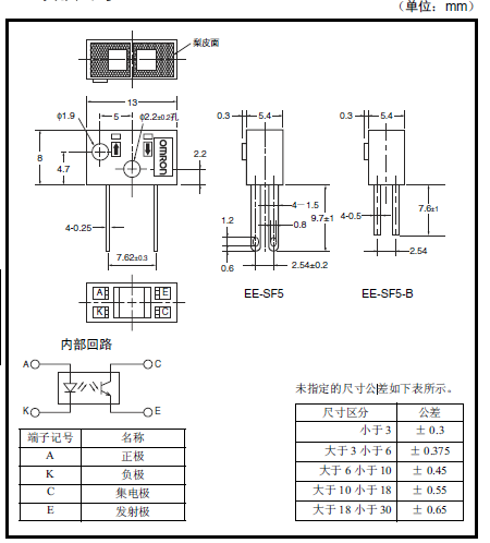 EE-SF5 微型光電傳感器[反射型] 為防塵構(gòu)造。 利用可見(jiàn)光濾光器減少日光燈的影響。 可用M3 螺釘安裝。 焊接用端子型:EE-SF5 印刷線路板用端子型:EE-SF5-B